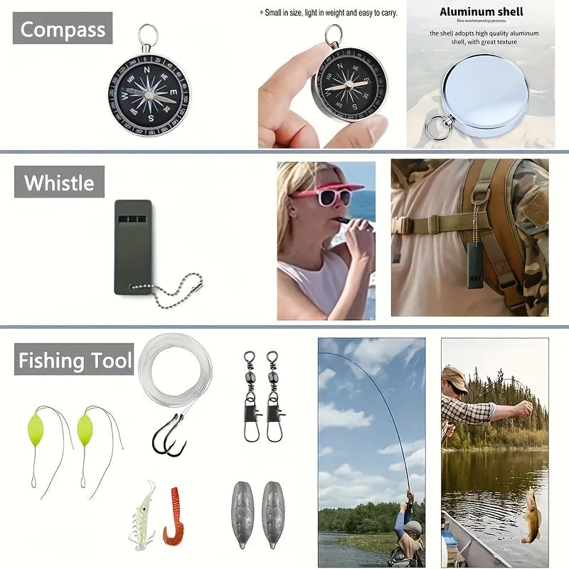 - Survival Tools: Emergency whistle, compass, fire starter, emergency blanket, and multi-purpose tools